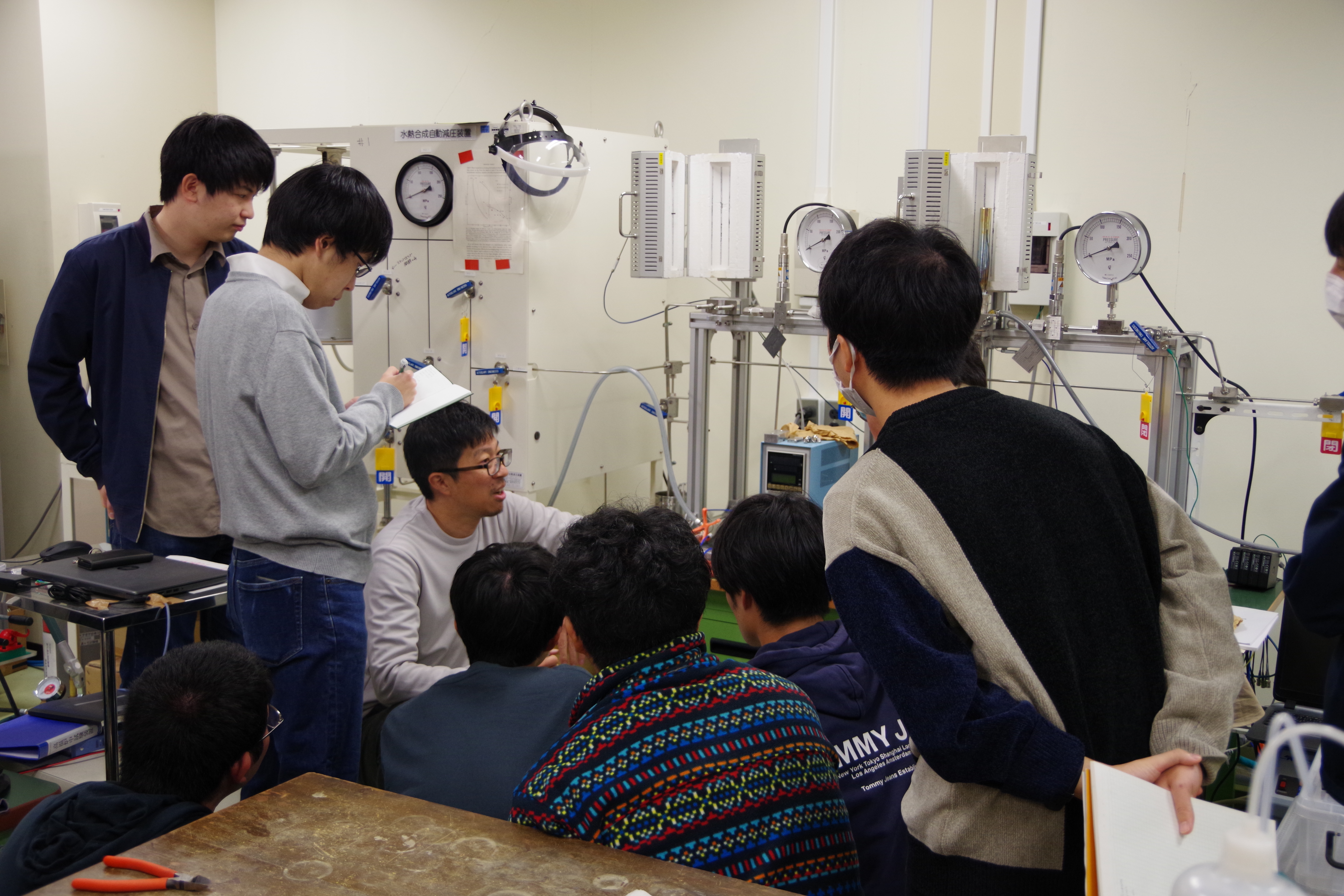 11月17日、18日に、東北大学において「実験学」に関するセミナーが行われました。受講生は各自事前に中村美千彦教授(東北大学大学院理学研究科地学専攻)による岩石学実験の基礎知識や分析方法に関する講義を聴講したうえで、奥村聡准教授や水野樹助教、研究室の学生の皆さんの指導のもと、水熱実験や岩石変形実験、浸透率測定やSEM観察の実習に臨みました。また、1日目の最後にはラボツアーが行われ、様々な実験・測定機器を見学させていただきました。